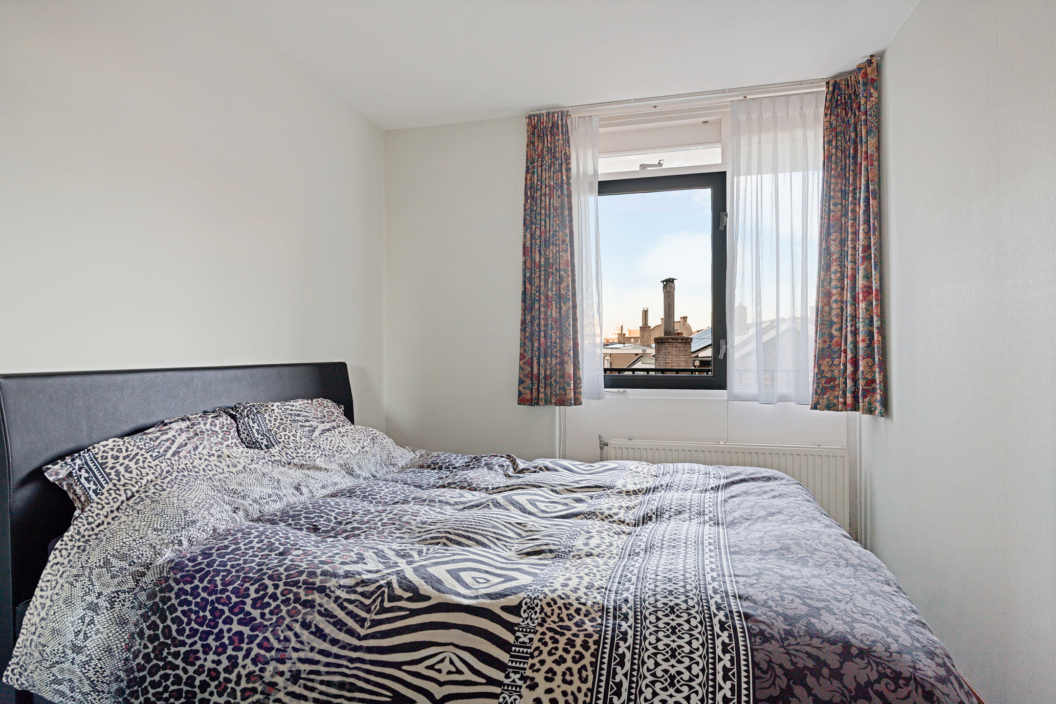 Achter de voordeur kom je in de lange, centrale hal die toegang biedt tot alle vertrekken van het appartement. Aan de galerijzijde bevinden zich twee goed bemeten slaapkamers, ideaal als hoofdslaapkamer en bijvoorbeeld een werk- of logeerkamer. De badkamer is uitgerust met een wastafelmeubel, toilet, inloopdouche en een aansluiting voor de wasmachine. Tegenover de badkamer ligt de inpandige berging met de opstelling van de cv-ketel.